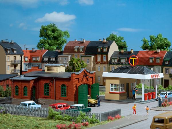 Комплекс АЗС "MINOL" и здание сервисной станции по ремонту и обслуживанию автомобилей. Модель подходит для масштабов H0 и TT.