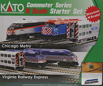 Стартовый набор - пригородный пассажирский поезд: тепловоз MP36PH, три двухуровневых пассажирских вагона Nippon Sharyo, овал рельс Unitrack, блок питания Kato 110В. Принадлежность Virginia Railway Express