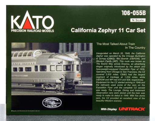 Набор из 11 пассажирских вагонов California Zephyr: багажный вагон “Silver Beaver”, вагоны с куполом “Silver Lodge”, “Silver Mustang”, “Silver Thistle”, вагон-буфет с куполом “Silver Lounge”, спальные вагоны типа 10-6 “Silver Mountain”, “Silver Falls”,“Silver Cliff”, вагон-ресторан “Silver Platter”, 16-ти секционный спальный вагон “Silver Larch”, и обзорный вагон с куполом “Silver Crescent”. В комплекте рельсы для установки вагонов, например, на полке.