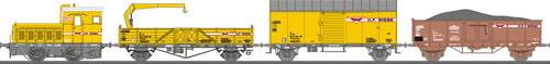 Строительный поезд: тепловоз V 15, вагон для инструментов, вагон со щебенкой и платформа с манипулятором. Эпоха V