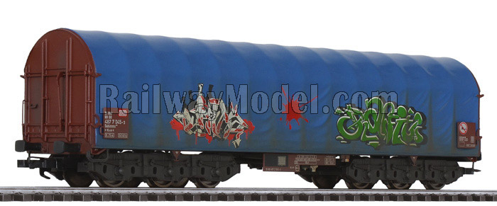 Шестиосный товарный вагон, покрытый синим брезентом, "Graffiti". Принадлежность DB, Германия. Эпоха V
