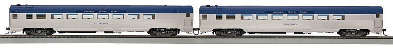 Два пассажирских вагона с рифлеными стенами. Установлено освещение. Принадлежность Nickel Plate