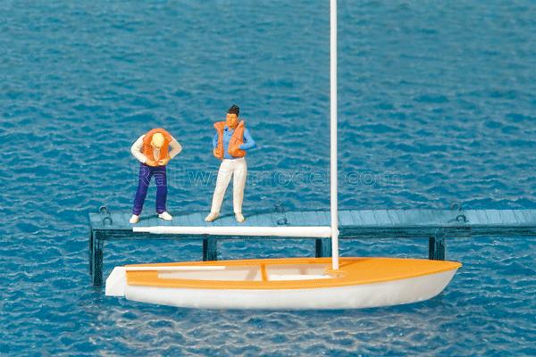 Яхта с моряками, моряки надевают спасательные жилеты, паруса спущены