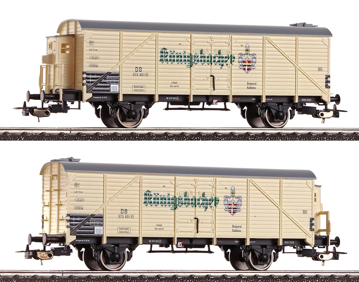Двухосный рефрижератор для перевозки пива Konigsbacher. Принадлежность DB, эпоха III. NEM-шахты для установки сцепок. Сцепки с накидной петлей. Металлические колесные пары. Производство PIKO (современное), артикул 54551. Серия Classic