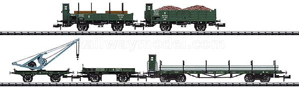 Серия Minitrix. Royal Bavarian K.Bay.Sts.B. Эпоха I 5-Car Freight Set. Omk & Low Side Gondolas w/Loads, SSml Flatcar w/Load & Crane/Tender
